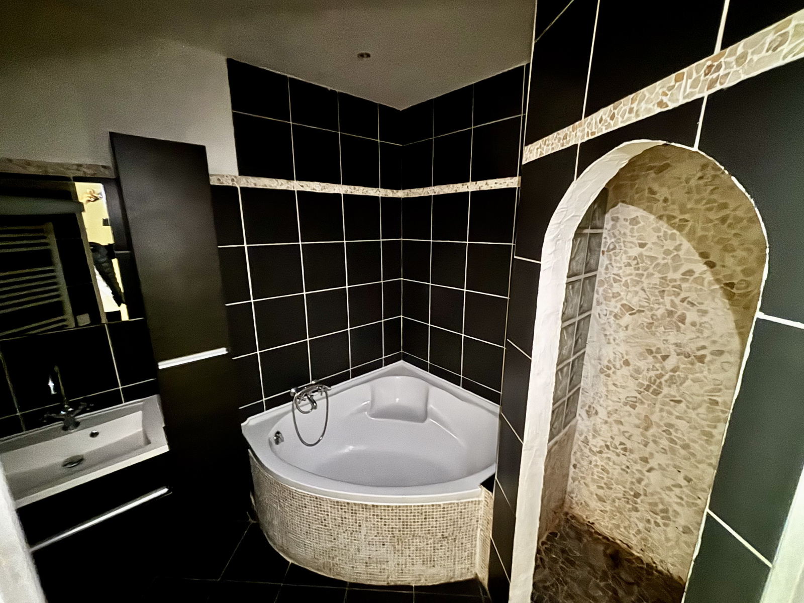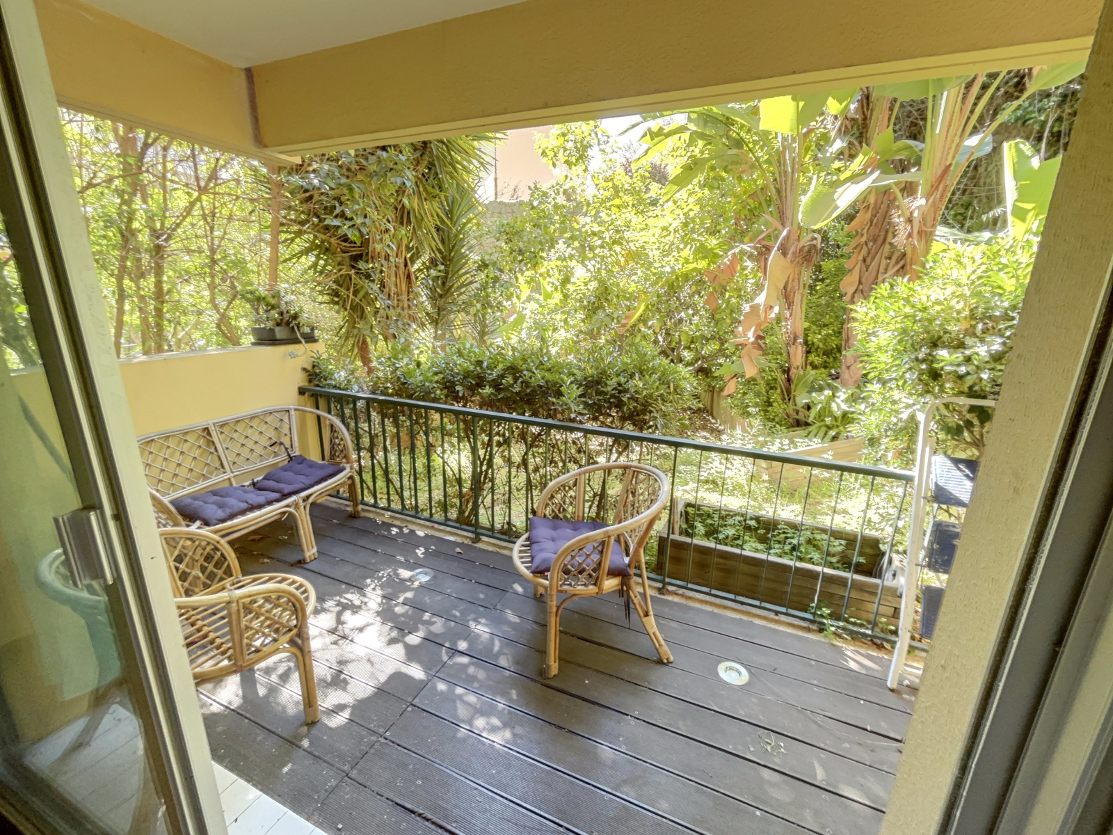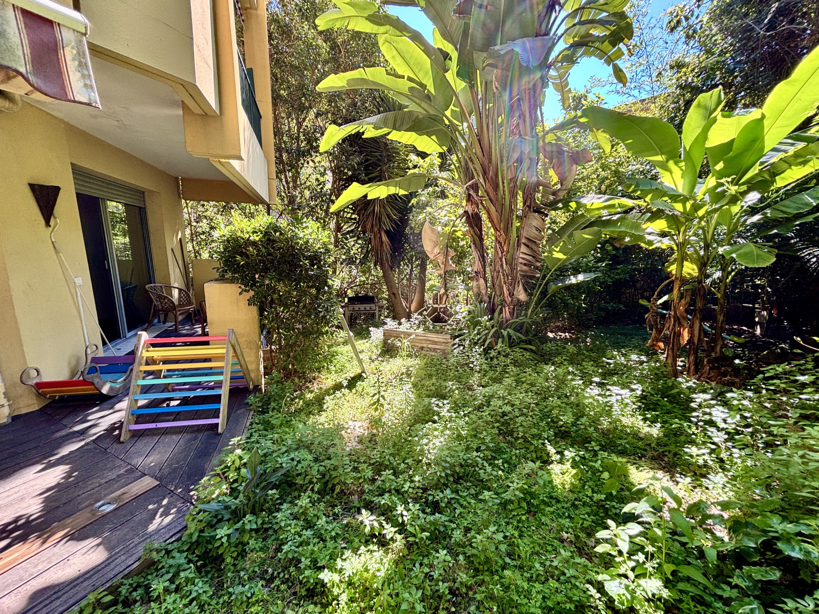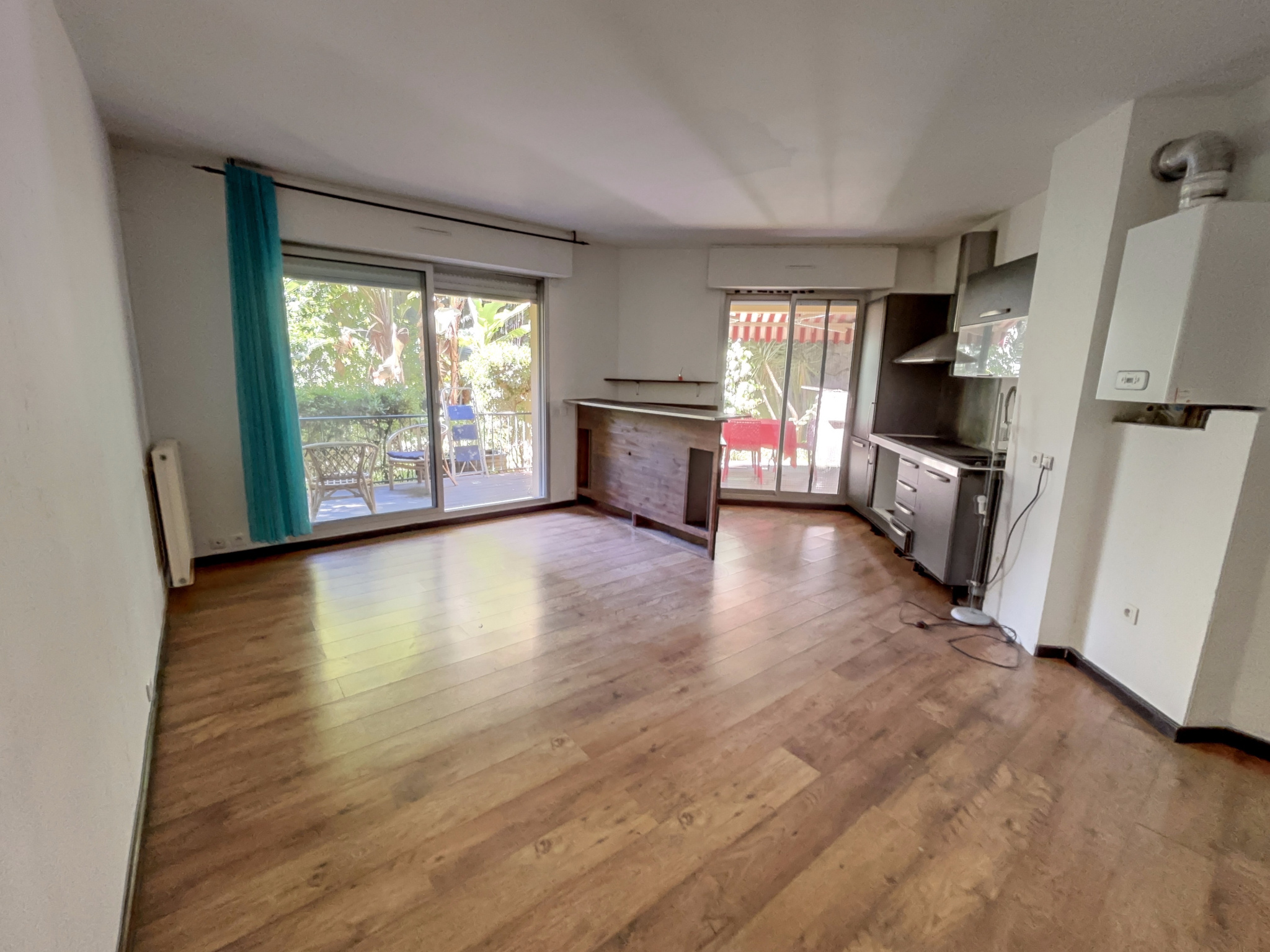 Vaste séjour avec cusine US sur terrase et jardin, 2 chambres, salle de bains avec douche et baignoire d'angle. WC indépendant avec lave mains